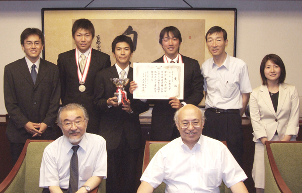 奥左より、上窪 恭太 さん(サブヘッドコーチ)、新木 邦生 さん、竹田 浩二 さん(コックス・副将)、夜久 智広 さん(副将)、河井 宏允 部長、氏家 久恵 さん(主務)、手前左より、尾池 和夫 総長、東山 紘久 副学長 >>優勝の際の様子