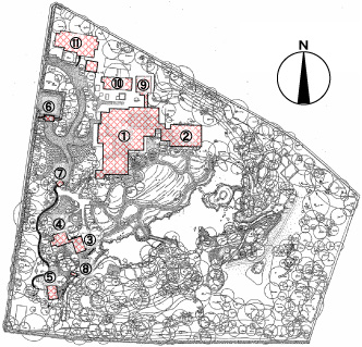 西園寺公望が控邸として使用した清風荘の建物です。江戸末期建築の茶室、大正期建築の主屋や離れなど優れた意匠、技術、材料による数寄屋建物が、庭園とともに落ち着いた空間を形成しています。