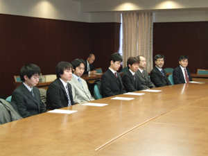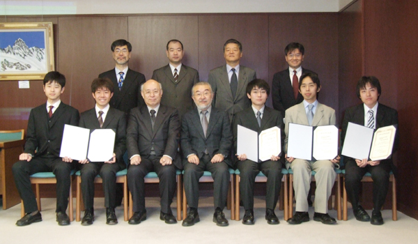 後列左から奥乃 博 情報学研究科教授、石川 裕 医学研究科助手、木谷 雅人 副学長、楠見 孝 教育学研究科助教授、前列左から岡本さん、遠山さん、東山紘久副学長、尾池総長、井手さん、北原さん、米田さん