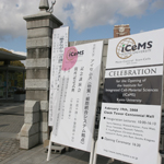 左から尾池和夫総長、松本紘副学長、北川進副拠点長、会場案内の看板