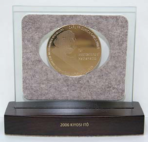 Kyoto University professor emeritus and former director of the Kyoto University Research Institute for Mathematical Sciences Dr. Kiyoshi Ito was awarded the newly created Carl Friedrich Gauss Prize for applications of mathematics at the International Congress of Mathematicians held in Madrid on August 22, 2006, and on September 14, 2006, International Mathematics Union (IMU) President Sir J. Ball personally presented the medal to Dr. Ito at a special ceremony held in Kyoto.