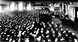 Photograph taken at the ceremony for the establishment of the university song and flag on 11 February 1940 in the 2nd Floor main auditorium of the Clock Tower (now the International Conference Hall)*Photographs from the Kyoto University Archives