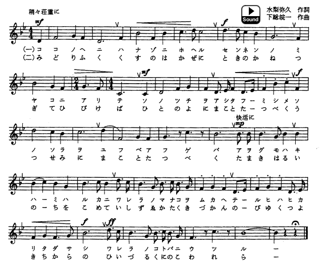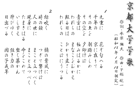 The university song and flag were established in 1940. Inspired by the "Imperial Rescript for Young Students", issued by the Emperor in 1939, the lyrics of the song and the flag design were selected from pieces written and designed by the students of the Kyoto Imperial University, as it was then known in those days.