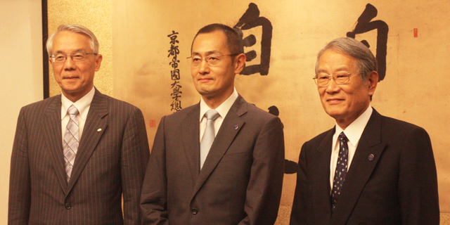 From left, President of Japan Science and Technology Agency Michiharu Nakamura, Prof. Yamanaka and President Hiroshi Matsumoto