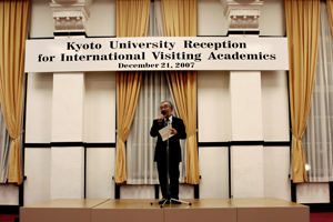 Kyoto University welcomes many visiting academics from overseas every year. If we include one-day visits, 3954 researchers from all over the world visited Kyoto University in the 2006 academic year. 792 of those researchers stayed with us for over two weeks. Unfortunately, however, I don't often have the opportunity to meet with many of our visitors, so I am looking forward to talking with many of the international visiting researchers here today.