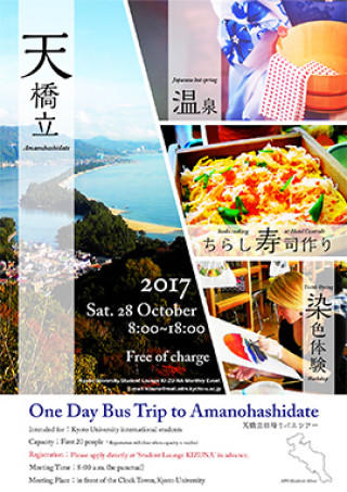 Participants will travel by chartered bus to Amanohashidate, one of Japan's three most scenic areas, to take part in activities such as Japanese traditional textile dyeing, sushi making at Hotel Centrale, and bathing in a hot spring (onsen).