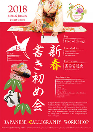 The January KIZUNA event is a kakizome calligraphy workshop, taught by members of Sumizome Shodo Kai, who offer regular lessons at the Kyoto Prefectural International Center.
