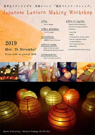 Kyoto-style paper lanterns are made using a unique method called jibari-shiki. Participants will learn the history of, and the steps involved in, this crafting process, and create small lanterns to take home, along with an electric lamp, as souvenirs.