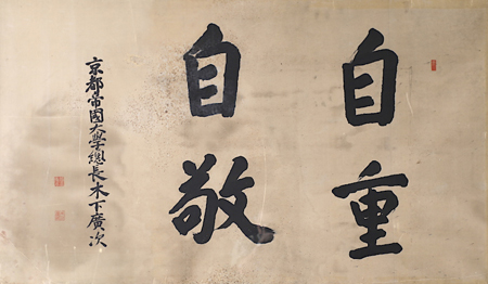 "Self-reliance and Self-respect" — this calligraphy by Professor Hiroji Kinoshita, the founding President of Kyoto University, set a distinctive tone for the life and ways of the University, encouraging initiative and trust within a socially engaged context.