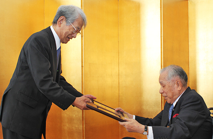 Mr Funai, right, receiving his Honorary Fellowship Certificate from President Matsumoto