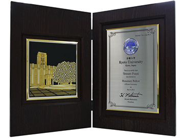 At the ceremony, after presenting the certificate and plaque, Kyoto University President Hiroshi Matsumoto expressed his gratitude by saying, "Mr Funai has contributed not only to Kyoto University but also Japan, and his support for our researchers and students is greatly appreciated." In turn, Mr Funai responded by saying, "I pledge to further devote myself to the pursuit of research and contribute to Kyoto University, living up to the title of Honarary Fellow. I sincerely hope from the bottom of my heart that Kyoto University will continue to foster global leaders who leave a lasting legacy."