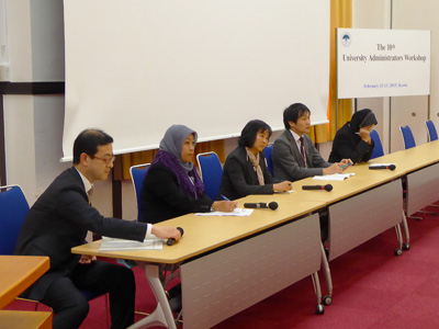 The 10th University Administrators Workshop was held at the Kyoto University Clock Tower Centennial Hall on 12-13 February 2015. The workshop, which has been held regularly since 2006, provides a platform for administrative and senior staff in charge of international exchange and overseas study programs to share their opinions and knowledge. The workshop focuses on issues of common concern relating to university operation, with a particular focus on enhancing internationalization efforts. The majority of attendees are staff from Kyoto University's partner institutions and the members of regional university consortia, such as the Association of Pacific Rim Universities (APRU) and the Association of East Asian Research Universities (AEARU).