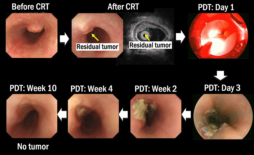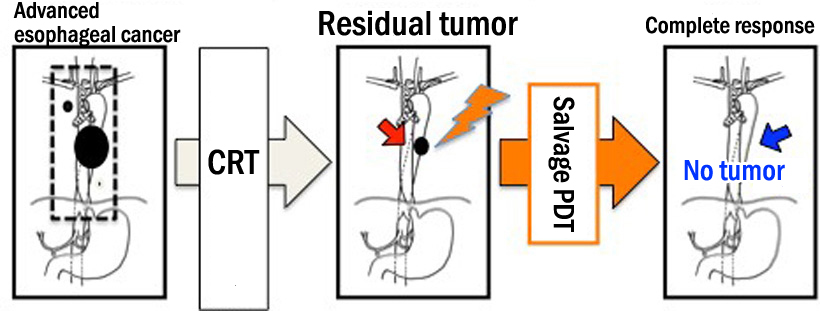 An investigator-initiated clinical trial led by Professor Manabu Muto of the Graduate School of Medicine (involving the seven institutions listed below) has demonstrated that photodynamic therapy (PDT) using Laserphyrin (talaporfin sodium) and semiconductor laser can be effective as a salvage treatment for esophageal cancer patients with local failure after chemoradiotherapy (CRT) or radiotherapy (RT); the procedure achieved a high complete response rate without serious side effects.