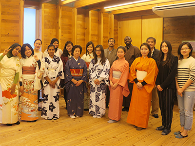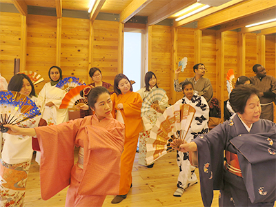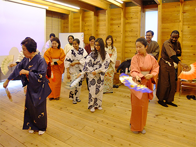 The 'KIZUNA' event for February was an introductory class in Japanese traditional dance, held in conjunction with the COCOLOIKI project, which is operated by the Education and Research Unit for Regional Alliances, Center for the Promotion of Interdisciplinary Education and Research (C-PIER). Instruction was provided by Ms Shisen Tatsumi from Murasaki no Kai, who teaches dance classes at universities and at the Kyoto Prefectural International Center.