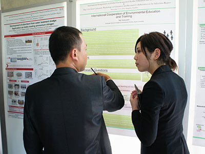 After program leader GSGES Professor Shigeo Fujii delivered opening remarks, participants divided into five groups, where they used presentation posters to share and discuss their research projects at length with fellow members.