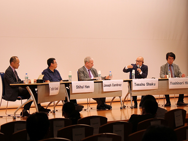 This was followed by Professor Tesshu Shaku from Soai University's Faculty of Humanities exploring the "Symbiosis of Religious Beliefs". Professor Shaku, who is also a Jodo Shinshu priest, offered insights and suggestions from diverse perspectives as to how religious beliefs, which by nature tend to be absolute and exclusive, can possibly coexist with one another.