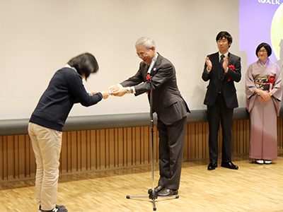 Finally, results of the "Walking Challenge -- Walk to the Moon!!", held 1-28 October 2017 to kick off the Healthy Campus initiative, were announced, with prizes awarded to winners randomly selected from the qualified participants. The winners received their prize certificates from Mr Asahara, Vice Mayor Murakami, Senior Director Nakajima, and Dr Naoki Sato, Kyoto University's executive vice-president for finance, facilities, and environmental health and safety.