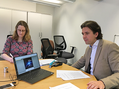 CSER's academic project manager Dr Catherine Rhodes (left) and Dr Weitzdörfer, in Cambridge talking via Skype with Professor Isobe and others in Kyoto