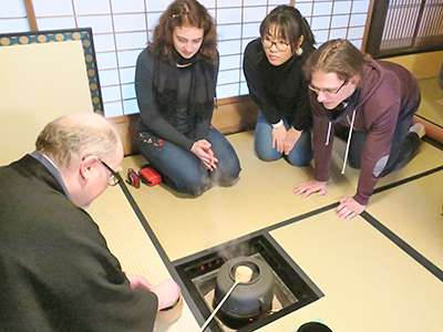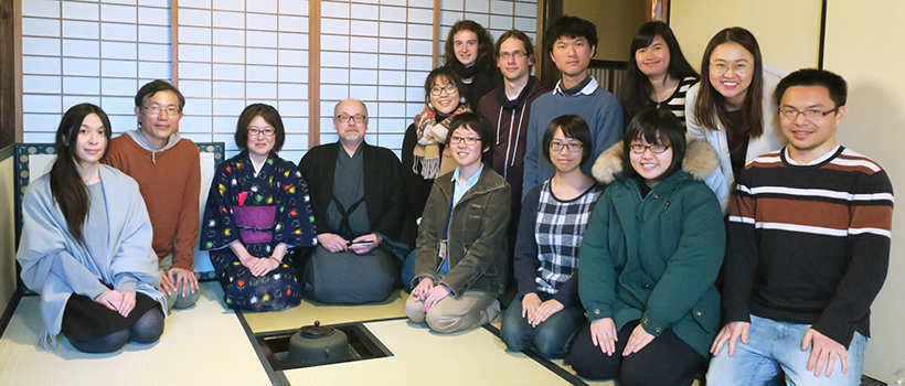 The KIZUNA event for February, held on the 27th, was a Japanese tea ceremony workshop, "Pleasure of a Simple Bowl of Tea". The venue was at Kanjoan, a well-known tearoom in northwest Kyoto. Kanjoan, meaning a "hut to be at ease and free of concerns", is part of a Japanese-style house renovated to offer an aesthetic setting for enjoying tea. The teacher was Mr Michael Drzmisek Sozui, a Swiss-born master of the Urasenke school.