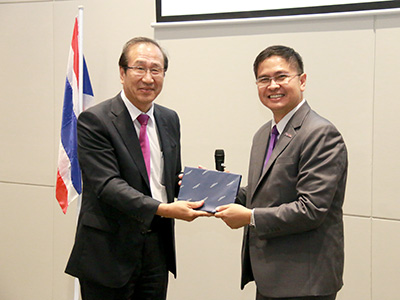 iCeMS Director Kitagawa (left) and VISTEC Associate Professor Khamphee Phomphrai, acting dean of the School of Energy Science & Engineering, exchanging gifts