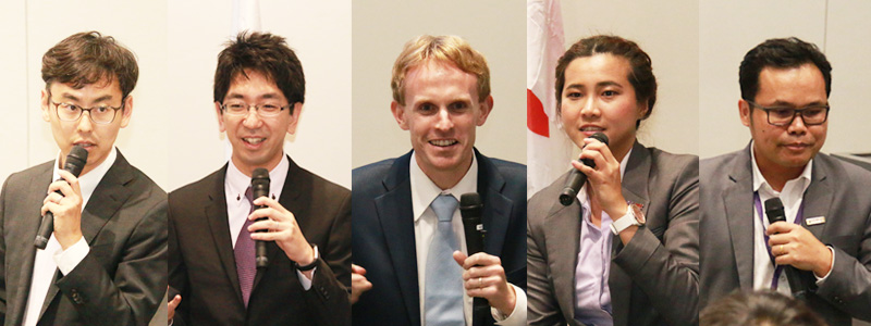 Symposium presenters, from left: iCeMS' Associate Professors Satoshi Horike and Daishi Fujita, and Junior Associate Professor Daniel Packwood, and VISTEC's Dr Chularat Wattanakit and Assistant Professor Montree Sawangphruk