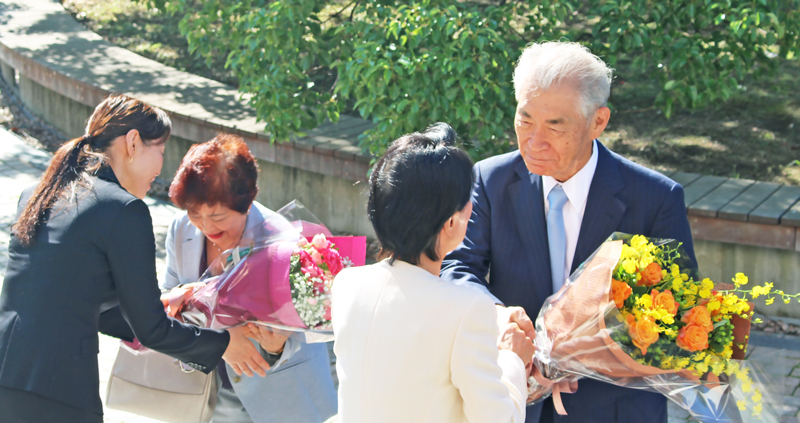 In the ceremony, held outdoors in front of the Clock Tower, Professor Honjo and his wife, Shigeko, each received a bouquet of flowers from the administrative staff of the Graduate School of Medicine, as a hearty round of applause rose from the assembled crowd.