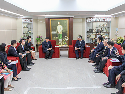 Prior to the conference, the KyotoU professors and officials attending the Thai event, along with First Secretary Ueno, JSPS Bangkok Office Director Yamashita, and ASEAN Center Director Shibayama, paid a courtesy visit to MU President Mahaisavariya.