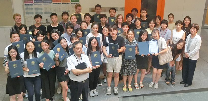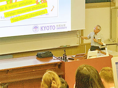 The curriculum featured four levels of Japanese language classes, as well as a wide range of lectures delivered in English by prominent faculty: "Sensing Technology-Based Food Production and Loss Reduction for a Projected 9-Billion Global Population" by Professor Naoshi Kondo of the Graduate School of Agriculture, "Aesthetics and Sensitivities of the Japanese as Seen Through Classical Japanese Literature" by Associate Professor Shikiko Yukawa of ILAS, "Evolution of the Human Mind as Viewed Through Studies of Chimpanzees" by Distinguished Professor Tetsuro Matsuzawa of the Kyoto University Institute for Advanced Study (KUIAS), "High Economic Growth and Minamata Disease: The Fight for Certificates Officially Acknowledging Victims of Methylmercury Poisoning" by Program Specific Assistant Professor Reiko Iida of the Graduate School of Asian and African Area Studies (ASAFAS).