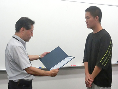 Receiving the certificate of completion from ILAS Director Hisashi Miyagawa