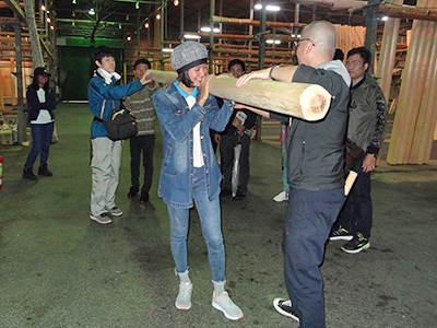 Carrying a log of Kitayama Japanese cedar at the Kyoto Kitayama-Sugi-no-Sato Center