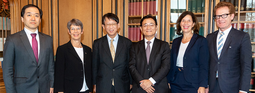 From left to right: Professor Manabu Muto (Graduate School of Medicine, Kyoto University), Professor Maries van den Broek (Vice Dean for Research, Faculty of Medicine, University of Zurich), Professor Ryosuke Takahashi (Department of Neurology, Graduate School of Medicine, Kyoto University), EVP Minato (Kyoto University), VP Schimmer (University of Zurich), and VP Schwarzenegger (University of Zurich)