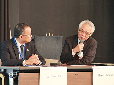 The symposium opened with an address from KyotoU President Juichi Yamagiwa, followed by greetings from the dean of the Graduate School of Global Environmental Studies (GSGES), Dr Shinya Funakawa. Keynote lectures were then delivered by Mr Istu Adachi, director-general of the Infrastructure and Peacebuilding Department of Japan International Cooperation Agency (JICA), and Mr Tomoyuki Kimura, director-general of the Strategy, Policy, and Partnerships Department of Asian Development Bank (ADB). The two speakers later took part in a panel discussion with Dr Le Van An, rector of Hue University of Agriculture and Forestry, and Dr Masao Kitano, Kyoto University's executive vice-president for education, information infrastructure, and evaluation. The session was chaired by GSGES Vice-Dean Takeshi Katsumi.