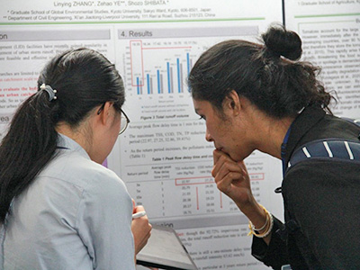 The afternoon program began with 43 brief platform presentations on environmental studies topics by students and early-career researchers, followed by 73 poster presentations. A special session on Kyoto University's "on-site laboratory" initiative then took place with an introductory presentation by Dr Yasuyuki Kono, vice-president for international strategies, and reports on seven of the laboratories established under the initiative, each delivered by one of its representatives.