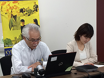 The ceremony opened with a welcome address by Professor Masao Kitano, KyotoU's executive vice-president for education, information infrastructure, and evaluation, followed by Professor Hisashi Miyagawa, director of the Institute for Liberal Arts and Sciences (ILAS), who delivered a presentation highlighting the superior and unique features of the University’s academic environment. The new iUP students then introduced themselves and watched two short videos, "Virtual Campus Tour" and "Kyoto iUP: Life" (both linked below), getting a feel for what they can expect on and off campus.