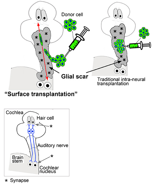Lost auditory nerve function was restored with the donor cells transplanted on the surface of glial scar.
