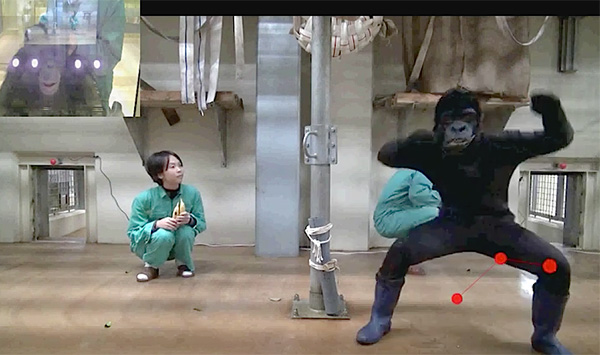 An ape viewer (upper left) intently watches a test film, anticipating that a researcher dressed in an ape costume will emerge from the right-hand door (as indicated by red, eye-tracking dots).