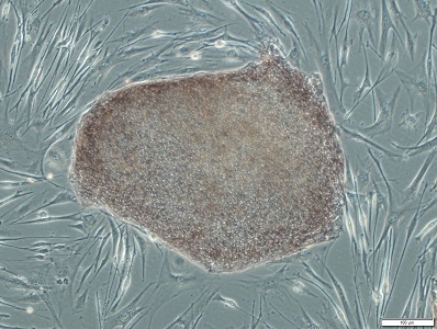 The Shin Kaneko lab found that reprogramming one type of iNKT cells to iPS cells and then differentiating them back results in reprogrammed iNKT cells (re-iNKT cells) that show properties of another type. The ability to make expand the number of iNKT cells is expected to advance cancer therapies. The microscope image is of a colony of iNKT cells reprogrammed to the iPS cell state. Scale bar is 100 μm