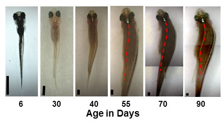 The red dotted line traces the curve in the fish’s spine as it developed symptoms representing adolescent scoliosis in humans. Black bars in the bottom left of each image are equivalent to 1mm. Images for ages 70 and 90 days are combined from two different exposures.