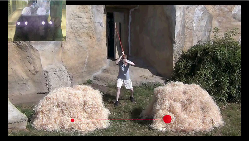 In the video, a human and a person dressed in an ape suit are engaged in a hide and seek-like scenario. An eye-tracker on a TV monitor follows an observing apes' gaze, recording where the ape anticipates the action will occur next.