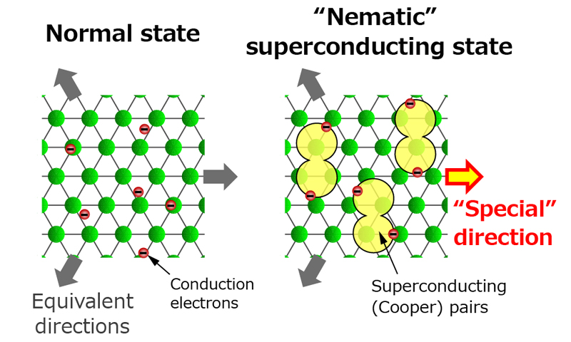 In its normal state (left), electrons in the compound do not feel any difference in the compound's three crystal lattice directions, while in a superconducting state, the strength of the electron pairs is reduced in a particular direction, leading to 'nematic superconductivity'.
