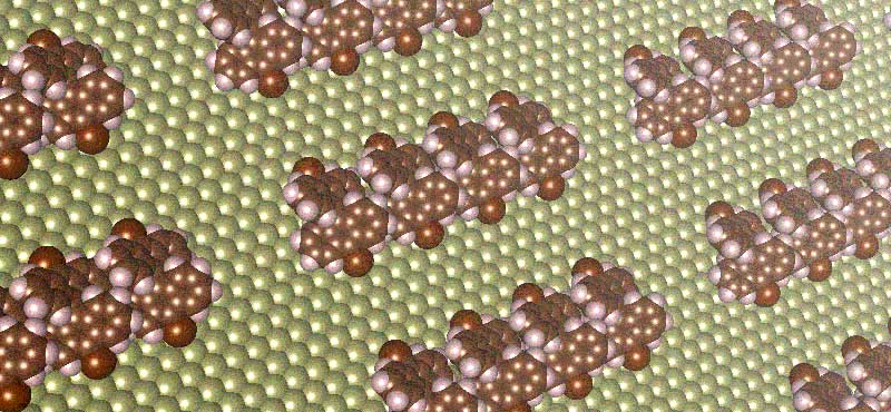 Formation of chain-shaped structures on a copper surface from molecular self-assembly, as predicted by a new computational method. These chain-shaped structures can function as tiny wires with diameters 1/100,000 th of a piece of hair for future electrical devices.