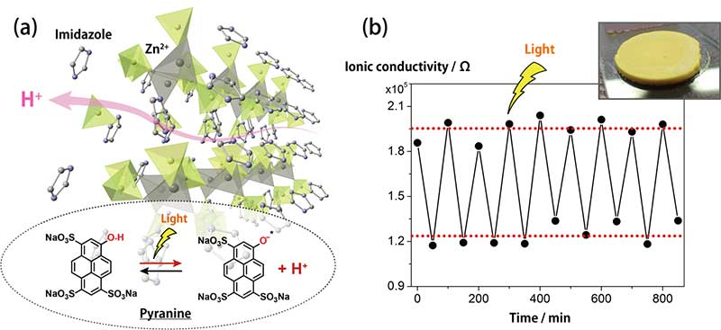(a) Crystal structure of H + conductive coordination polymer and doped pyranine molecule, which releases/captures H + by light irradiation. (b) Observed H + conductivity switching property by on/off light irradiation.