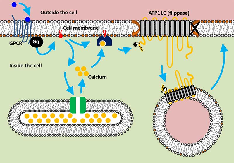 The team further demonstrated that this increase in calcium is triggered by a series of well-studied signaling proteins called G-protein coupled receptors -- or GPCRs. Specifically, when receptors for serotonin and histamine were activated, calcium levels in the cell increased and triggered the network that transports ATP11C. Once the signaling stopped, the flippase was recycled back to the membrane.