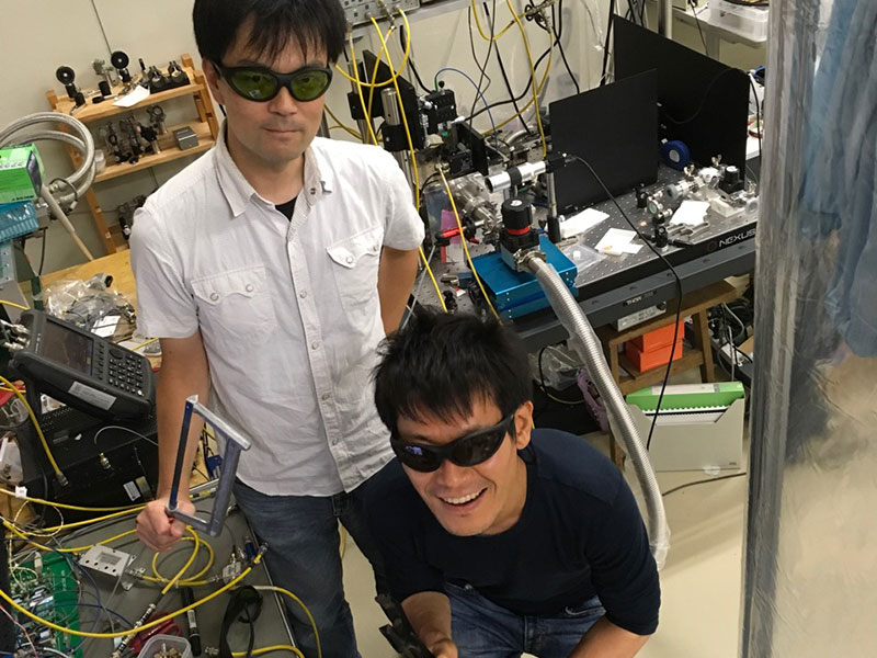Dr. Kazuyuki Takeda (left) and Dr. Koji Usami (right) with their experimental system ( Kyoto University / Kazuyuki Takeda)