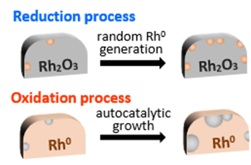 The team found that Rh reacts differently when under oxidative or reductive conditions. In the oxidation process it was observed that the oxidized points gradually grew and expanded on the surface. In contrast, during the reduction process, the metallic state was reduced swiftly and randomly.