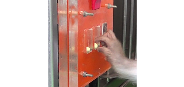 One test to determine recovered dexterity after SCI. Subjects pick out food from thin slots and their time is recorded. (Kyoto University / Takada Lab)