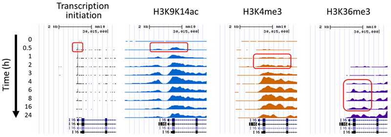 H3K9K14 was consistently increased between 30 min and 2 hours after the stimulation, H3K4me between 1 and 4 hours, and H3K36me3 between 8 and 24 hours.