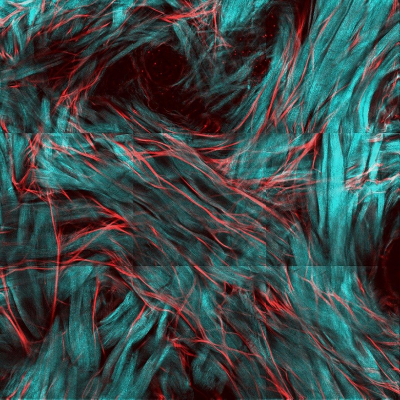 Collagen fibers(turquoise)are arranged in a mesh-like structure. The elastic fibers(red)also share the same architecture(Kyoto University/Susumu Saito)