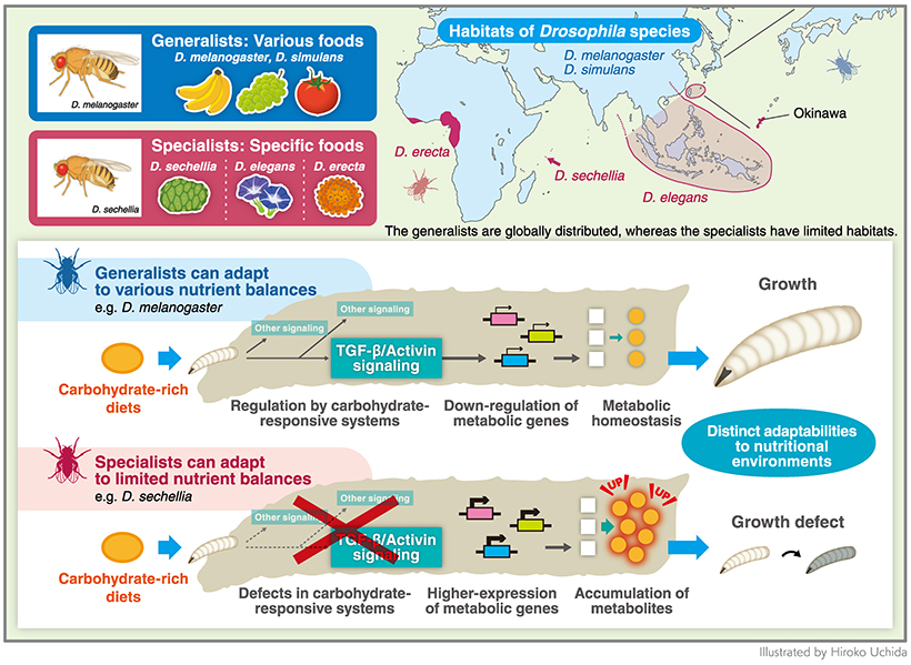 "Uncovering the differences in the molecular mechanisms between nutritional generalists and specialists can help us understand how organisms adapt to variable nutritional environments," explain Kaori Watanabe and Yukako Hattori of Kyoto University's Graduate School of Biostudies who lead the study. "In our investigation, we changed the nutrient balance in the food of different Drosophila species and compared their nutritional adaptability along with their transcriptional and metabolic responses."