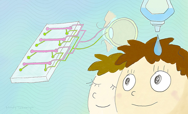 The new “cornea-on-a-chip” device can reproduce the pressure of moving tears inside a blinking eyelid, and can more accurately test the effects of drugs on the human eye. (Illustration by Izumi Mindy Takamiya (CC BY 4.0))